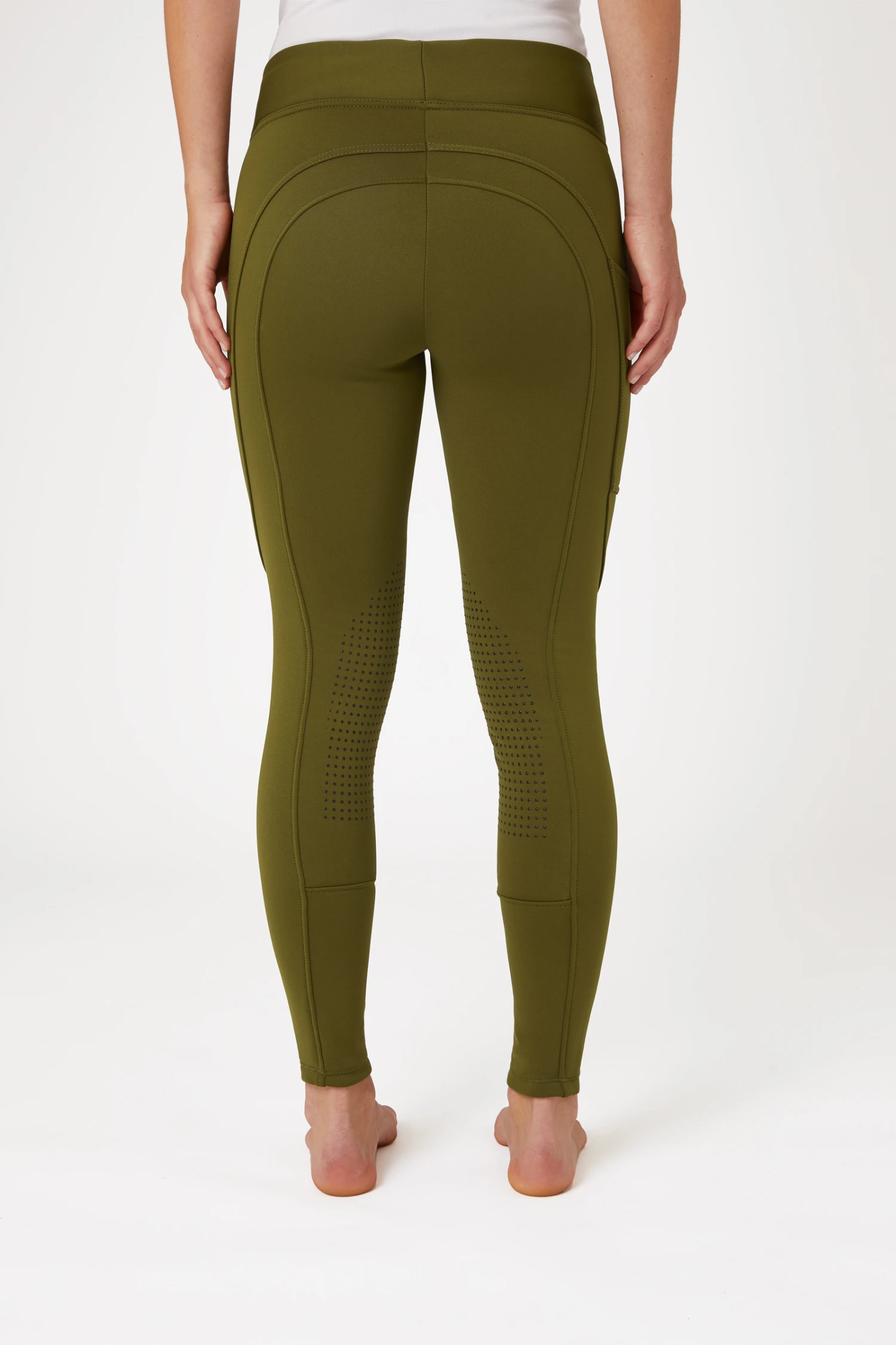 Warmes Futter macht diese Reitleggings zu einem Winterfavoriten. Der mittelhohe Bund ist bequem und schneidet nicht ein. Weites, atmungsaktives Material mit gebürsteter Innenseite ist ideal, um die Wärme für angenehme Winterausritte zu halten. Der Silikonkniebesatz sorgt für Flexibilität im Sattel. Die Tasche bietet Platz für dein Handy.