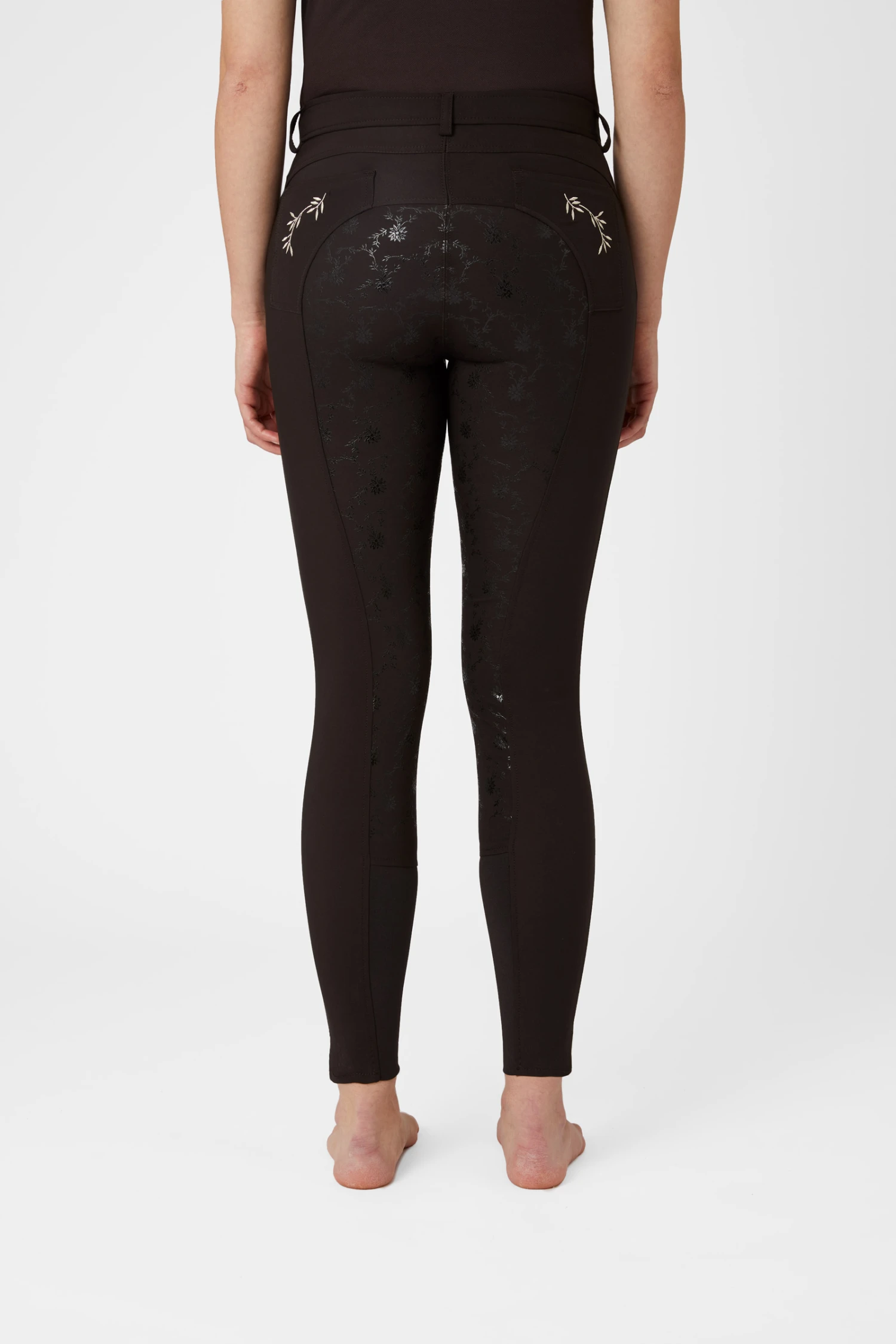 Die Horze Kaitlin Reithose besteht aus weichem, elastischem Material. Vordertaschen mit Reißverschlüssen bieten Platz für dein Handy. Die Hintertaschen sind mit silbernen Blättern bestickt und passen zu dem floralen Silikonvollbesatz. Gedeckte Farben passen perfekt in deine Reitgarderobe.
