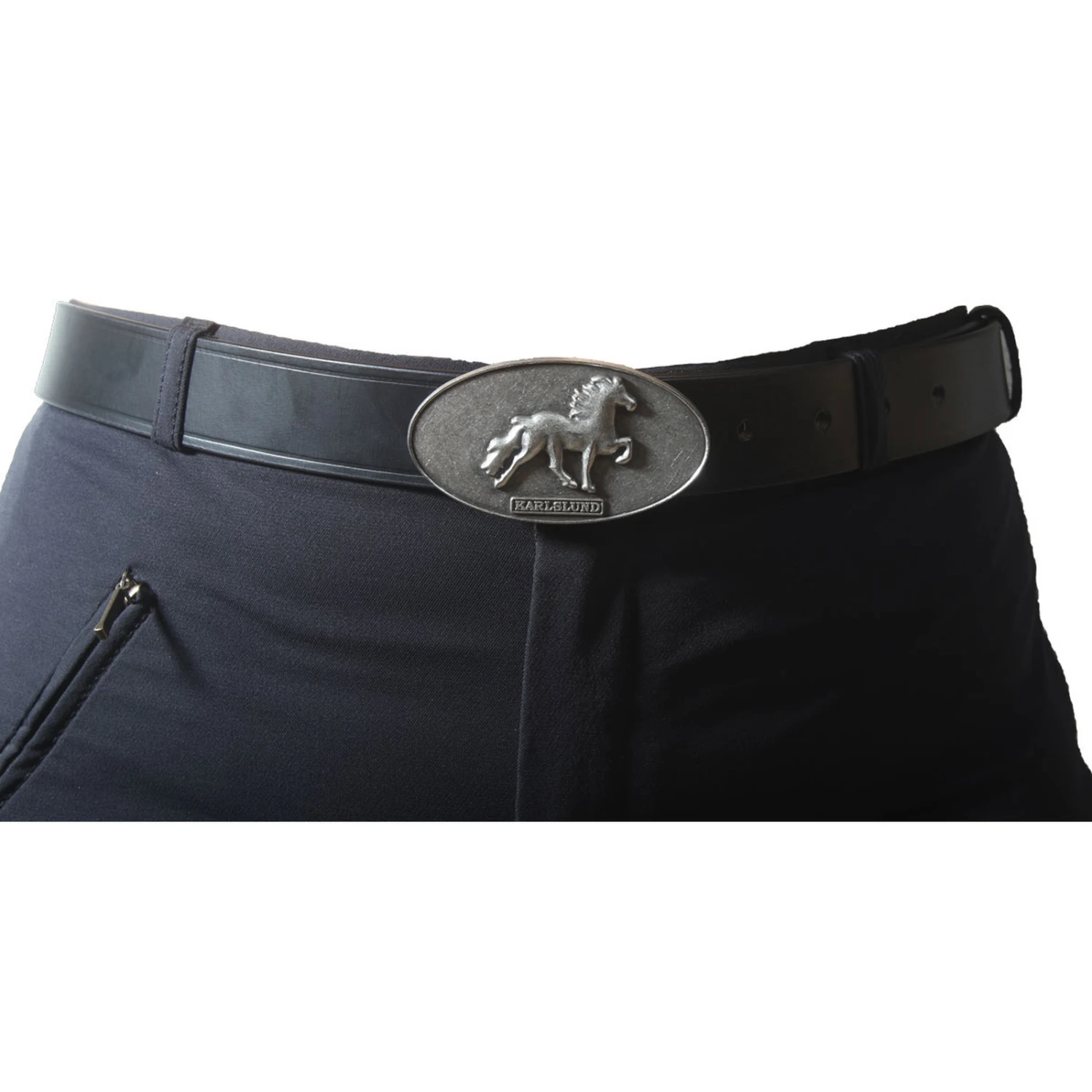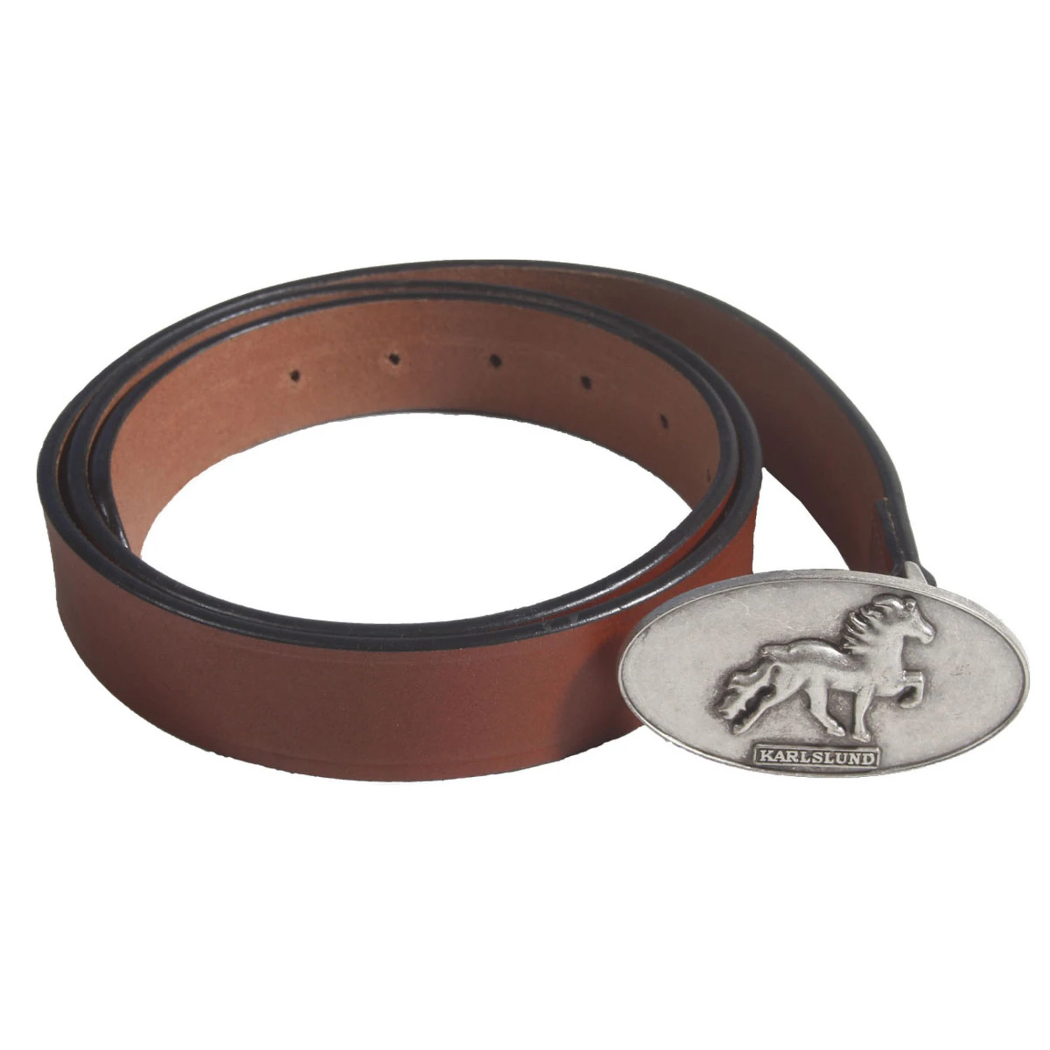 Schöner Gürtel aus gutem Qualitäts-Leder mit wunderschönem, rustikalen Islandpferde-Design auf der Schnalle. Passt zu Karlslund Reithosen.