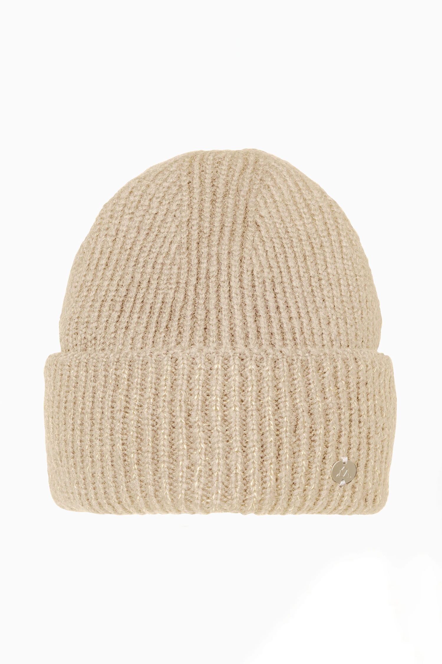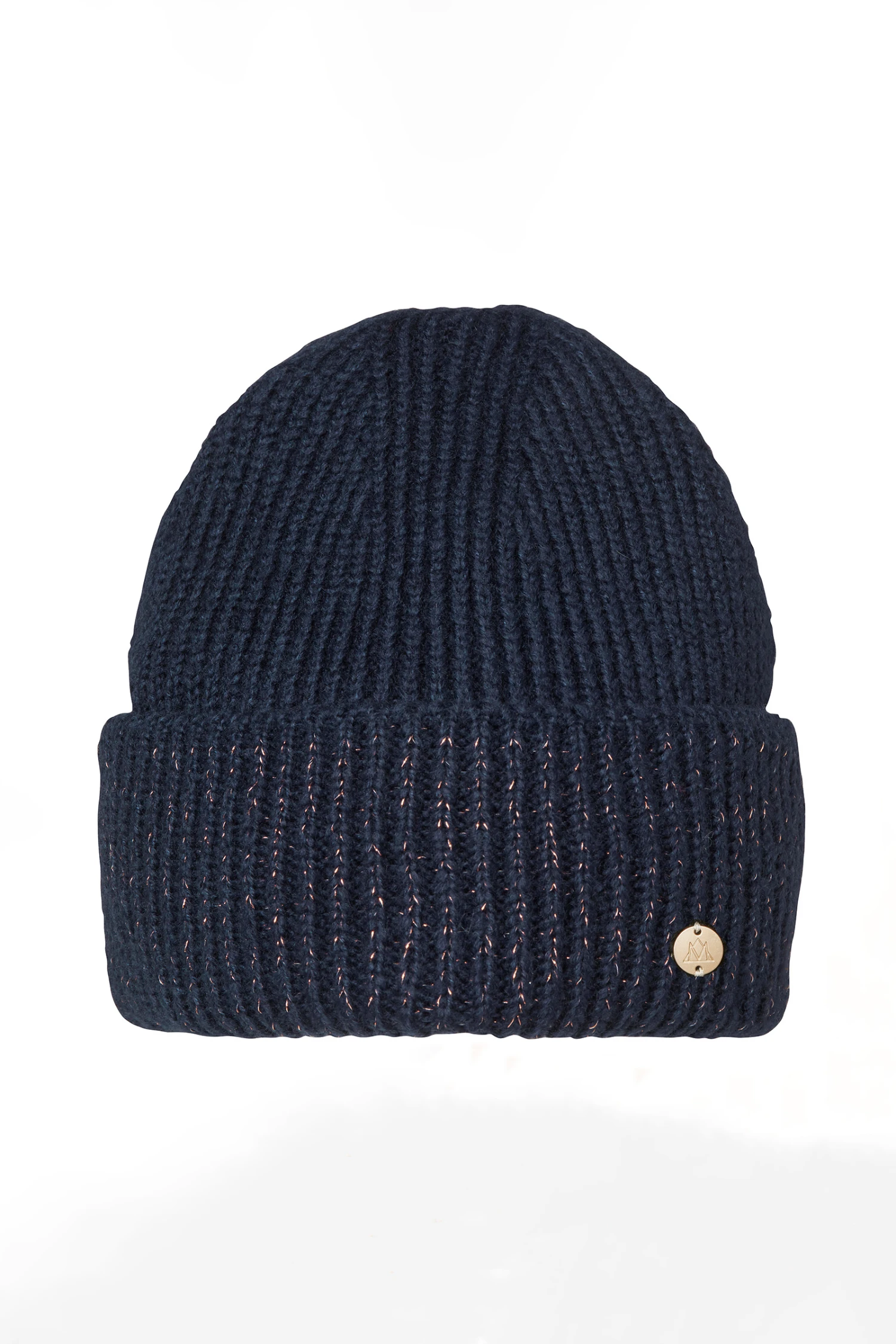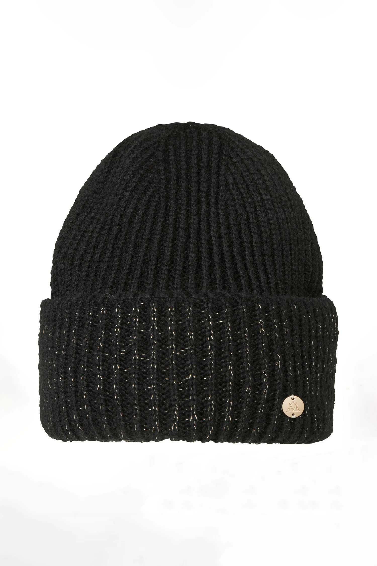 Gemütliche, doppelt gefaltete Strickmütze mit glitzerndem Lurexfaden und schickem MH-Logoabzeichen.