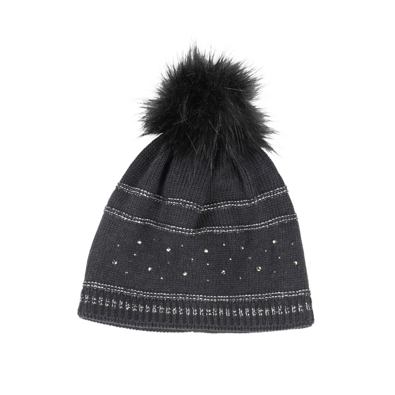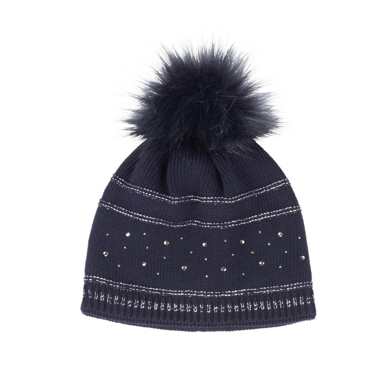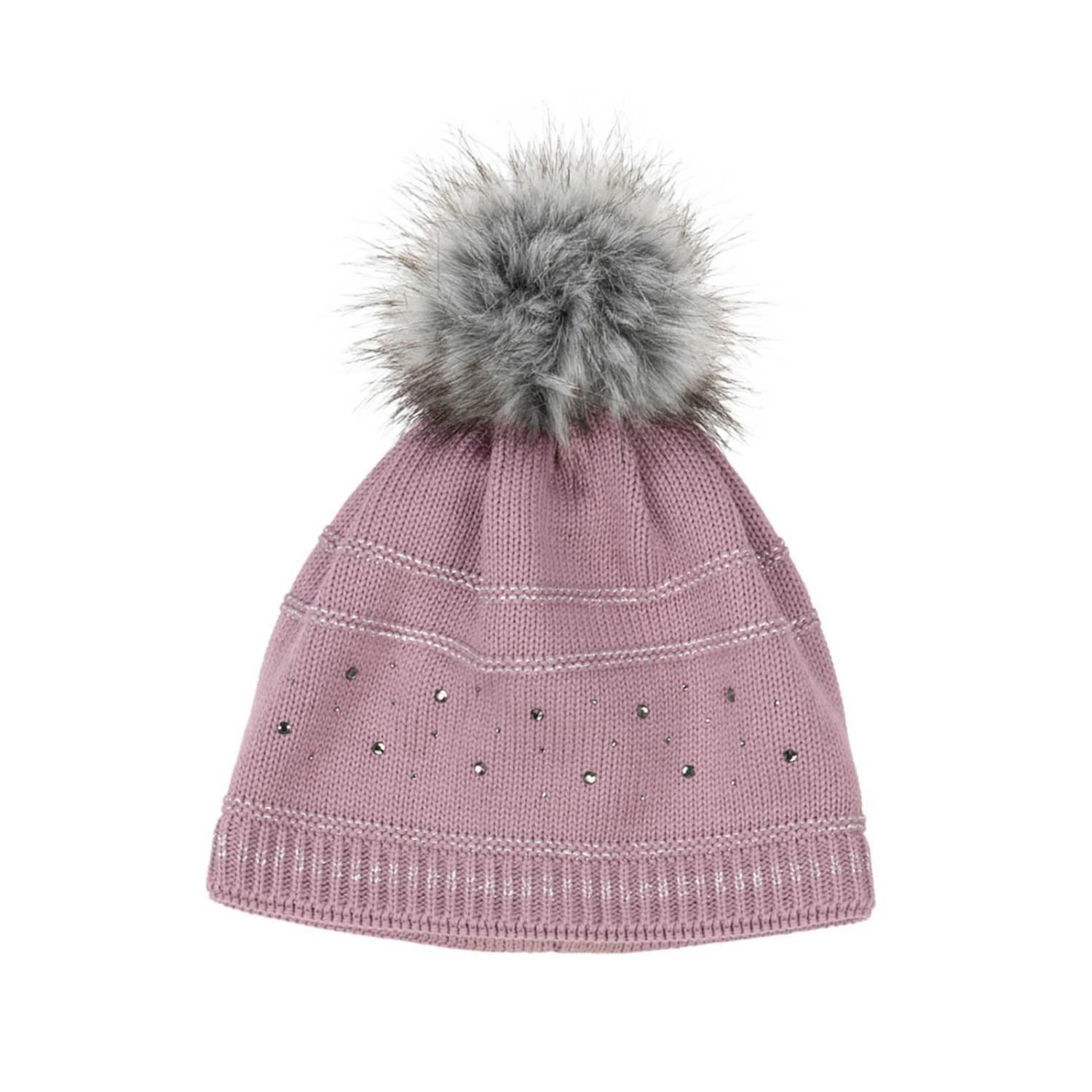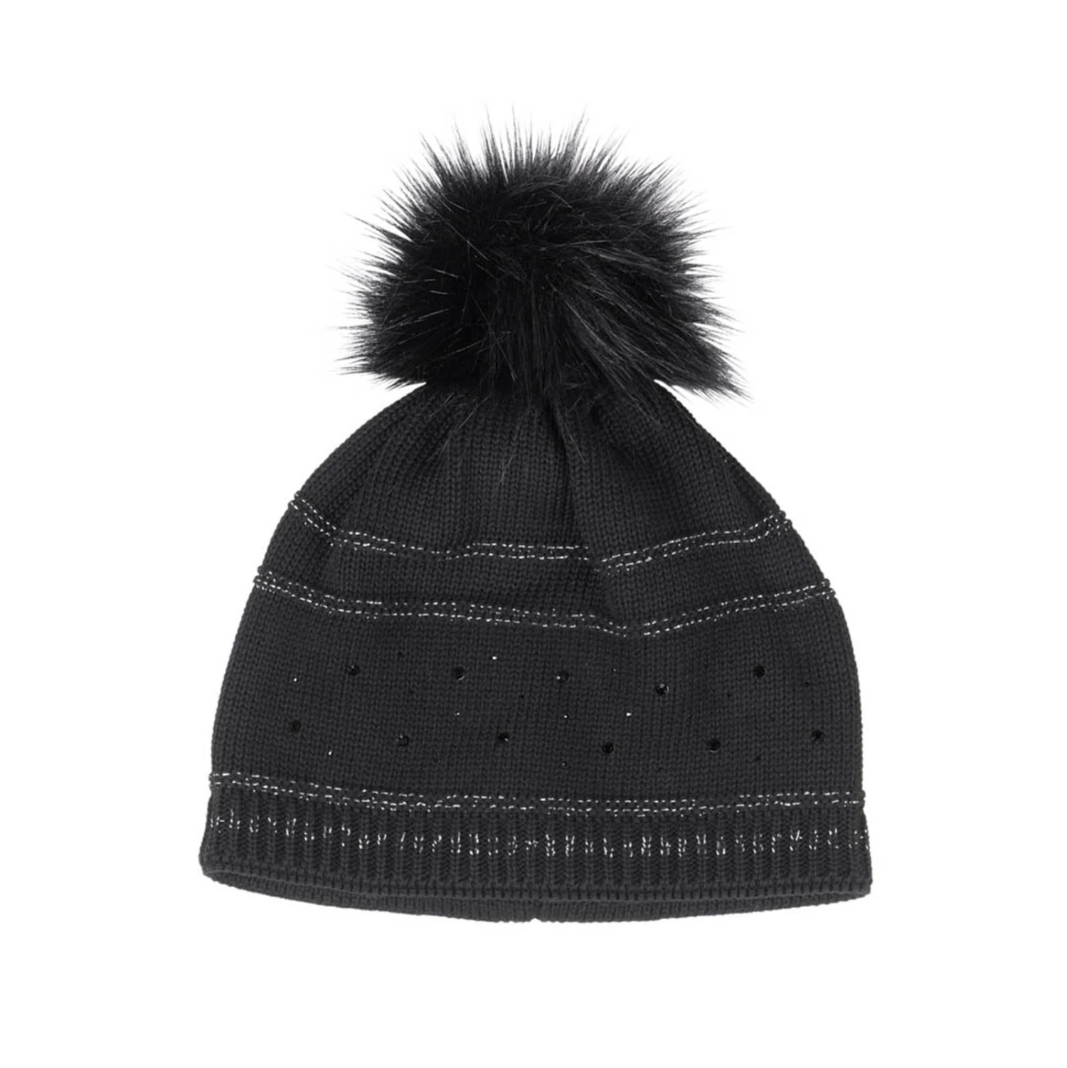 Super schicke Mütze mit Bommel, Strass und Lurexstreifen.